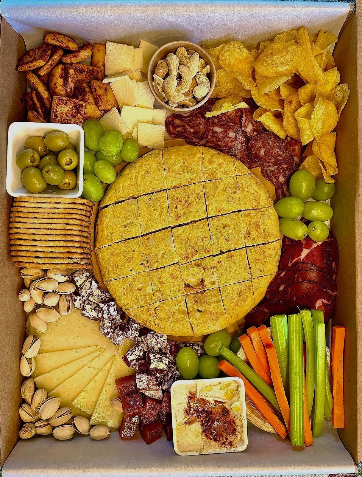 Inclou; truita de patates amb ceba, tacs de fuet, llonganissa, llom, humus amb pastanaga i api, olives, torradetes de tomàquet i orenga, cruixents crackers, formatge manxec i parma i tot complementat amb raïm i codonyat